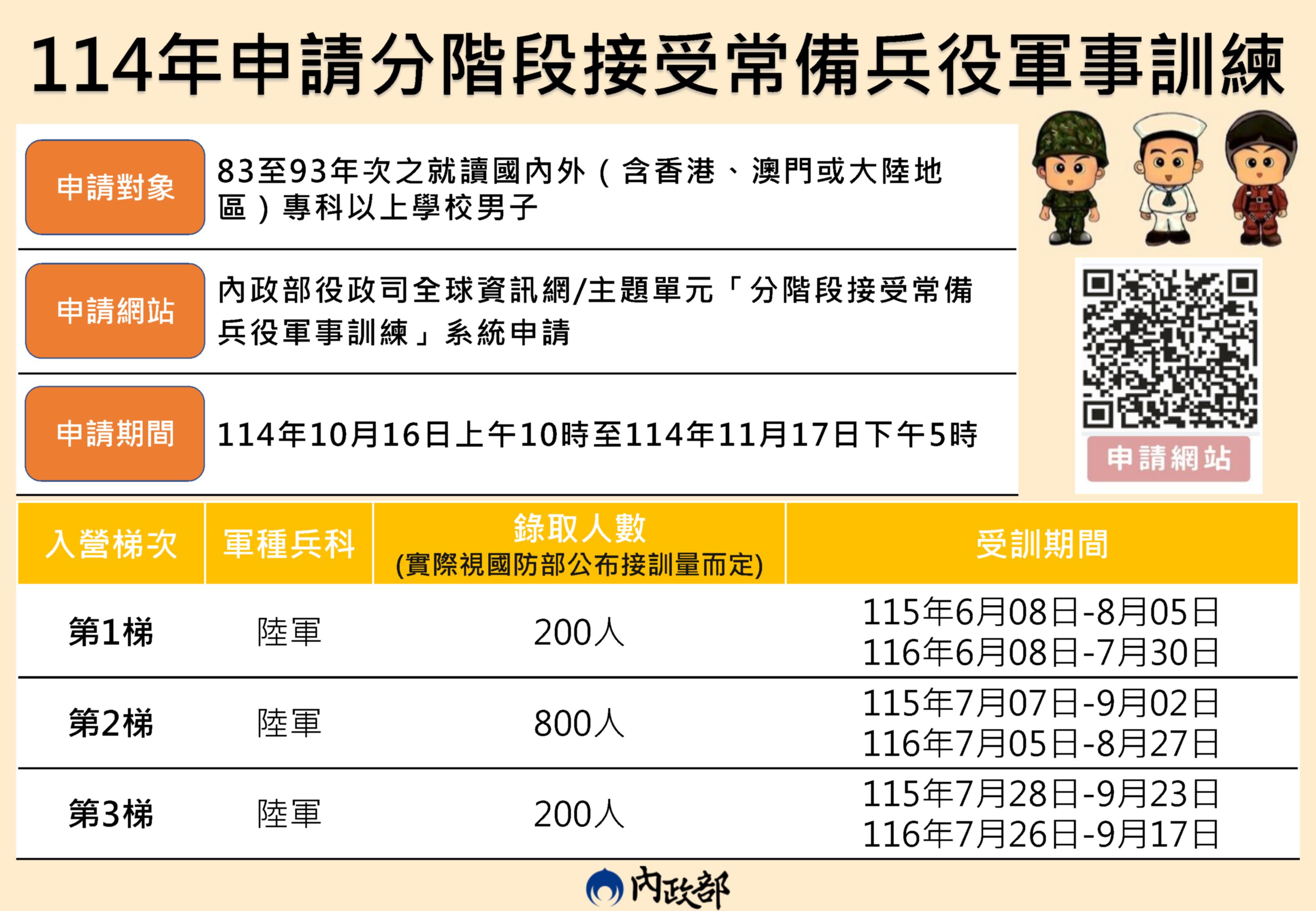 國防部將提供3個入營梯次統一賦予「陸軍」軍種,並接受陸軍軍事訓練,各梯次錄取員額及受訓日期詳如圖示。