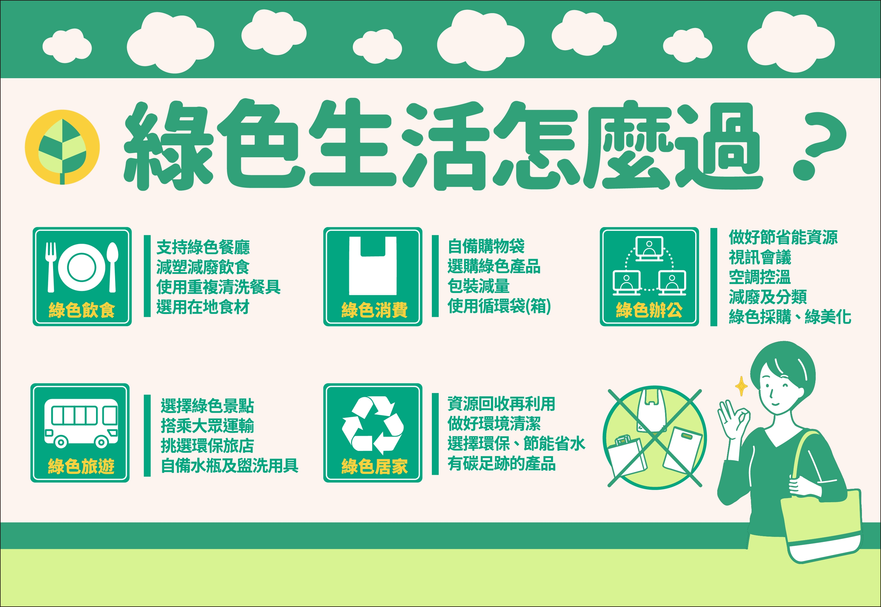 臺灣的空氣污染源有六成都在我們的環境中生成,空氣品質指標(AQI)中目前最常超標的污染物是PM2.5,其次是臭氧。綠色生活「環保4R原則」鼓勵從源頭減少浪費,涵蓋 Reduce(減少使用)、Reuse(物盡其用)、Recycle(循環再用) 和 Replace(替代使用)可減少環境衝擊。