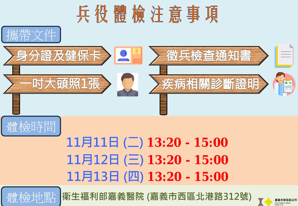 1.應攜帶證件:役男徵兵檢查通知書正本、身分證及1吋大頭照1張(請於背面書寫姓名及里別)。